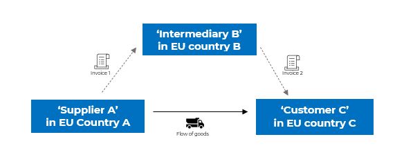 Por ejemplo, la parte B es una compañía establecida en Francia que recibe un pedido de productos textiles de la parte C, una compañía española. Los productos son fabricados en Italia por el proveedor A. Aunque B vende los bienes a C, la mercancía es directamente enviada de A- en Italia a C – en España.